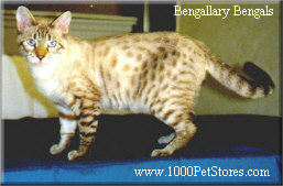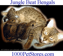 Judy's Jungle Jewels.. Bengal cats are a high energy, water loving, fascinating exotic breed that are part wild Asian Forest Leopard. Our Bengals have great pelts and glitter( metallic gold dusting on ends of pelts) They come for Quad Champion and Supreme Grand Champion bloodlines. Our kittens are raised in our home, underfoot, on laps and shoulders, and in our hearts. They are acclimated to children and our dog. Located in Independence MO. 816-252-9126 8158@prodigy.net