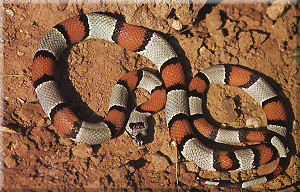 Physical Characteristics - The head is hardly set off from the neck. The body is long but very strong. The large eyes have round pupils. The scales are smooth, and the anal plate is undivided. Its body is ringed with brick to bright red and sulphur yellow to white bands. These red and white bands or rings are set off from each other by wide black edges. The tip of the snout is white or yellow, and the top of the head and the areas immediately behind the eyes are black. The chin is white or yellow, and the yellowish belly is covered with square blotches.