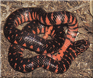 Distribution and behavior - Found in Virginia, North and South Carolina, Georgia, Florida, and Alabama. Some species are found in Illinois, Indiana, Kentucky, Arkansas, Mississippi, Missouri, Oklahoma, Tennessee, Lousiana, and Texas. The Mud Snake inhabits plains up to an altitude of 650 feet. It spends most of its time in the water. It especially likes cypress swamps, wet lowlands, and small and large ponds surrounded by dense vegetation. It often lies under logs. When picked up it won't bite, but will roll itself up in a ball, displaying the read and black warning colors on its belly.