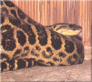 Physical Characteristics - The long head is barely set off from the neck. The ground color is a lovely, light, yellowish brown with large, dark blotches on the back. The blotches on the sides are much smaller, irregular in shape, and without the yellow centers characteristic of the E. murinus. A wide, dark band connects the eye to the corner of the mouth. The belly is yellowish to porcelain colored and mottle with black.