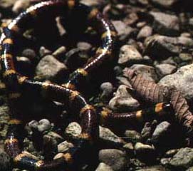 Description: Beautifully marked with bright blacks, reds, and yellow. To identify the species, remember that when red touches yellow it is a coral snake.
