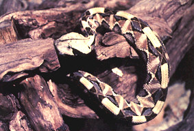 Description: Pink to brown with a vertebral series of elongated yellowihs or light brown spots connected by hourglass-shaped marking on each side. It has a dark brown strip behind each eye. This dangerous viper is alsmost invisible on the forest floor. A 1.8 meter long Gaboon viper could weigh 16 kilograms.