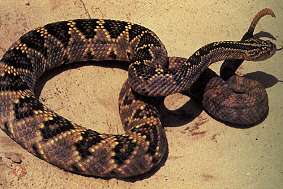 Characteristics: Extremely dangerous with an irritable dispostion, ready to strike with little or no warning (use of tis rattle). This species has a highly toxic venom containing neurotoxic and hemotoxic components that paralyze the central nervous system and cause great damage to tissue.
